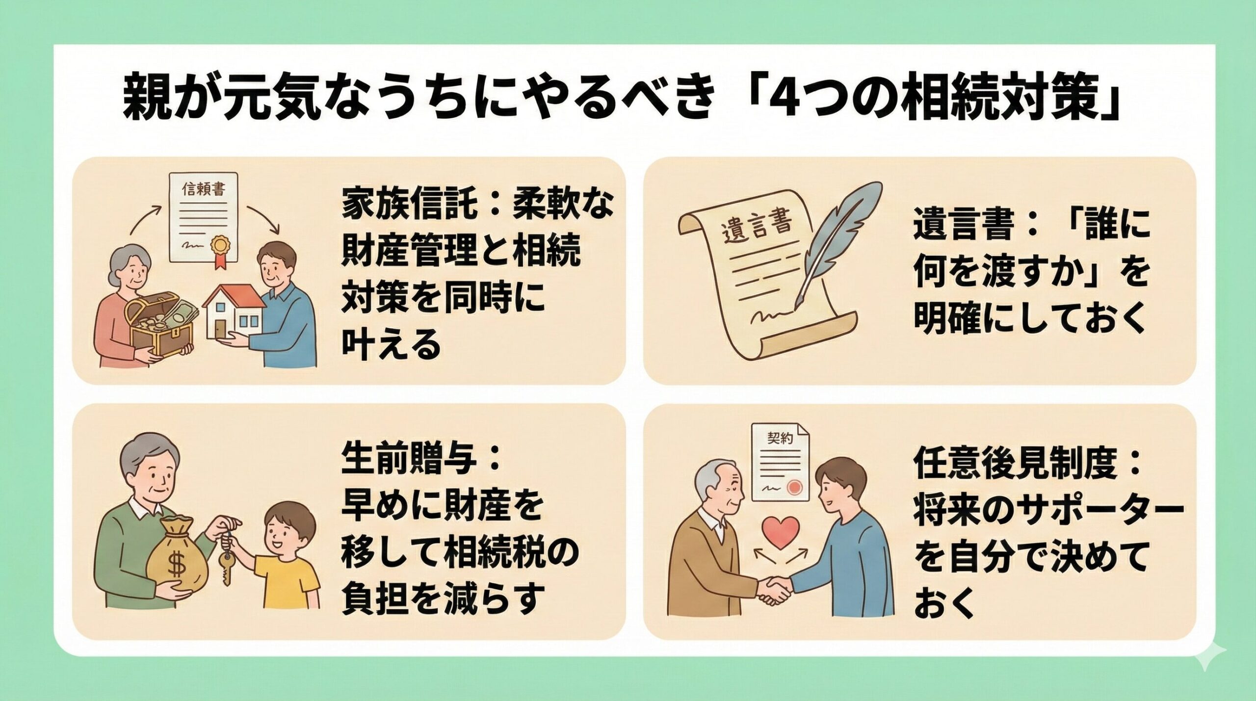 • 鉄則:相続対策は「親が元気なうち」にしかできない。早めの対策を。