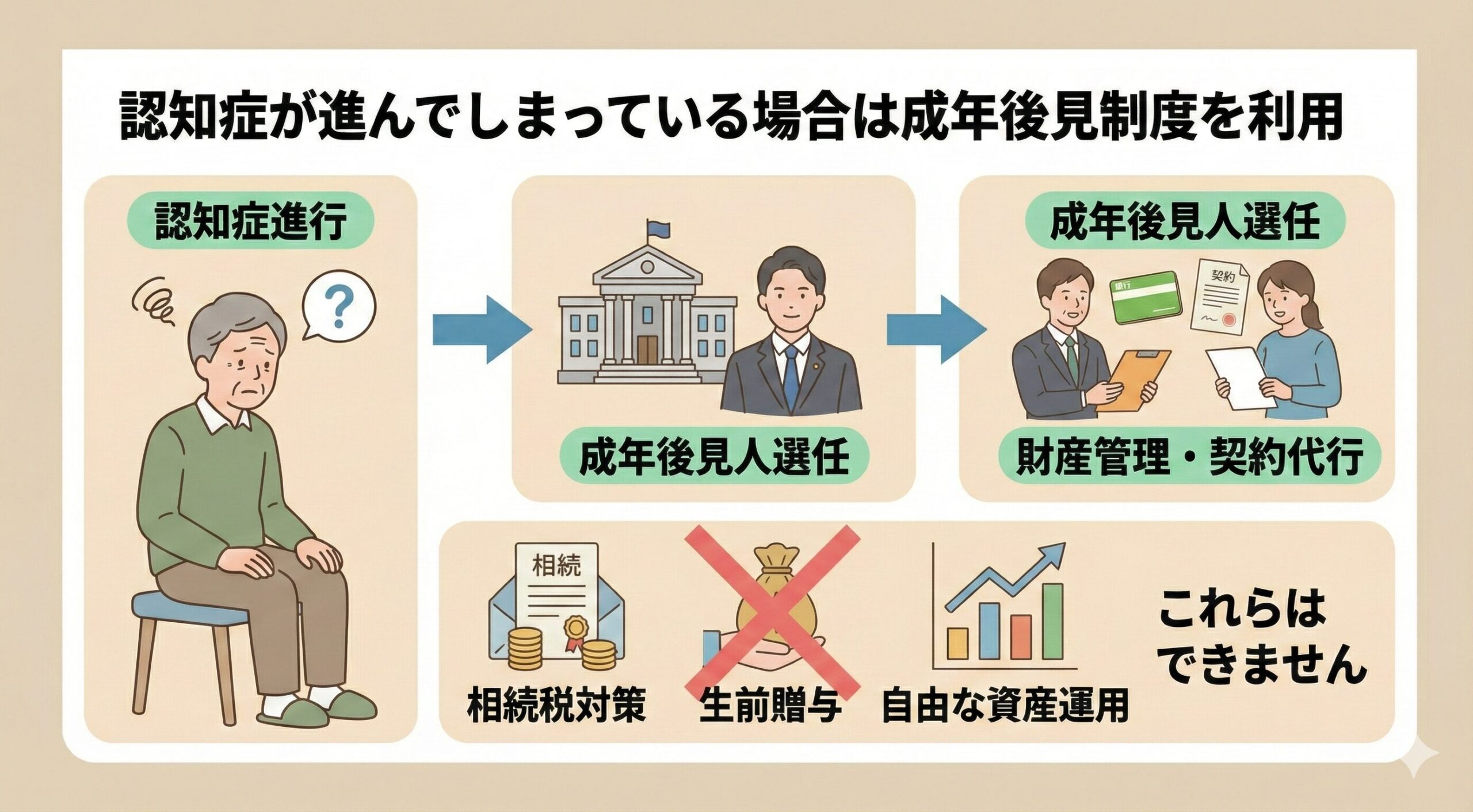 • 認知症が進行してしまった場合:判断能力を失うと、相続対策は「成年後見制度」のみとなる。