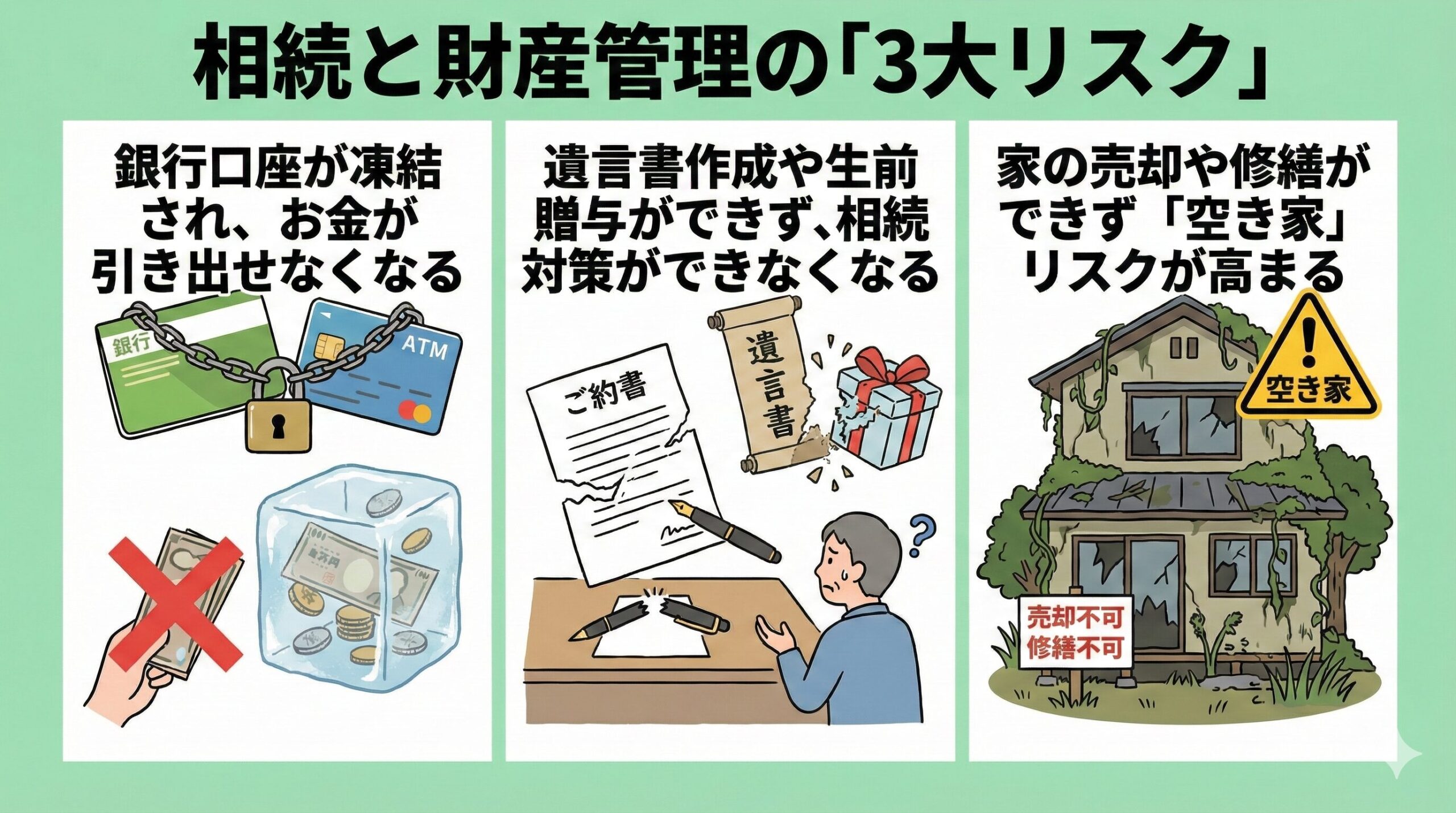 • 認知症になった場合のリスク: 判断能力を失うと、「口座が凍結する」「不動産売買ができなくなる」など、資産が塩漬けになるリスクがある。